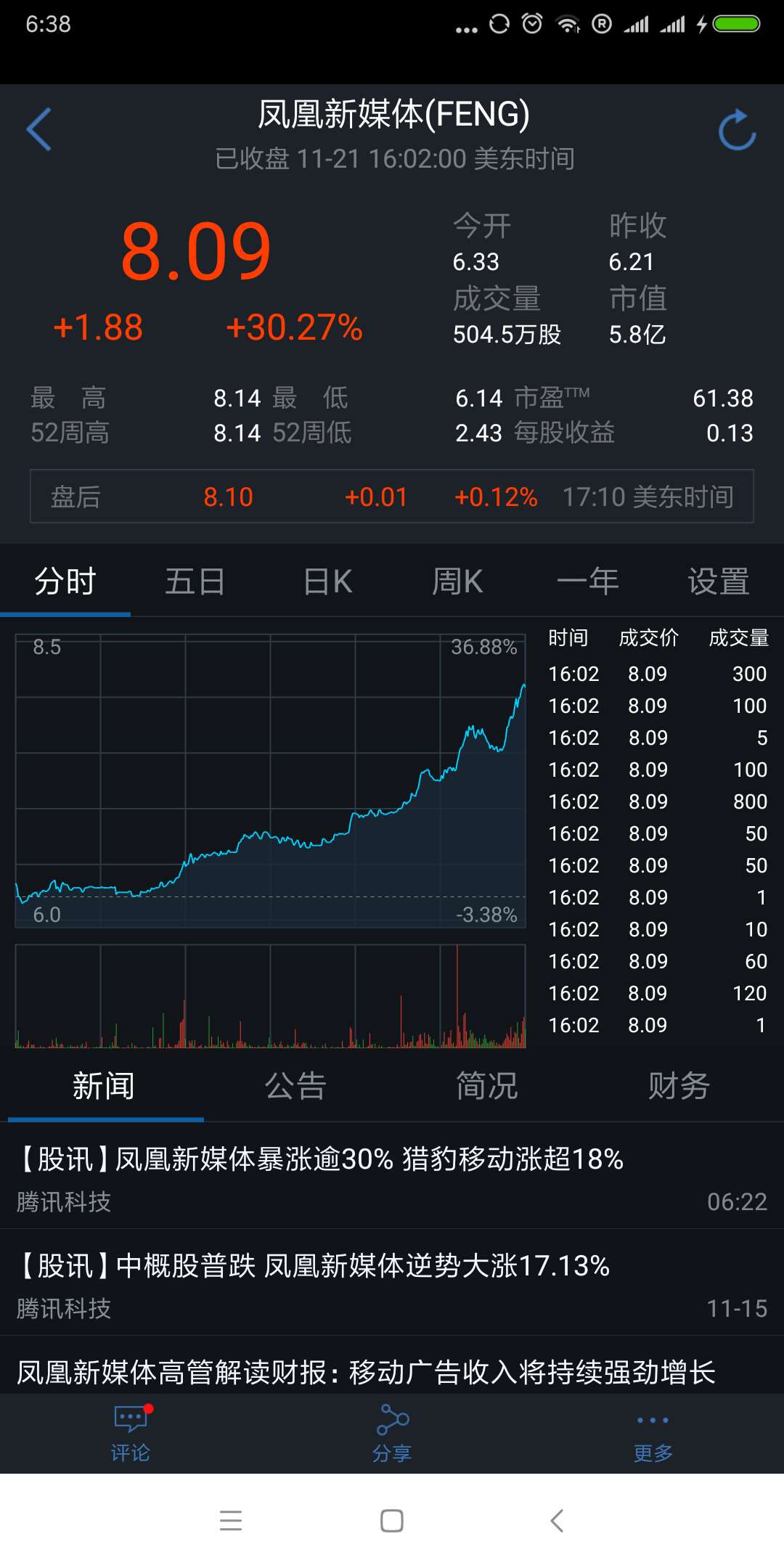 凤凰传媒股市概况